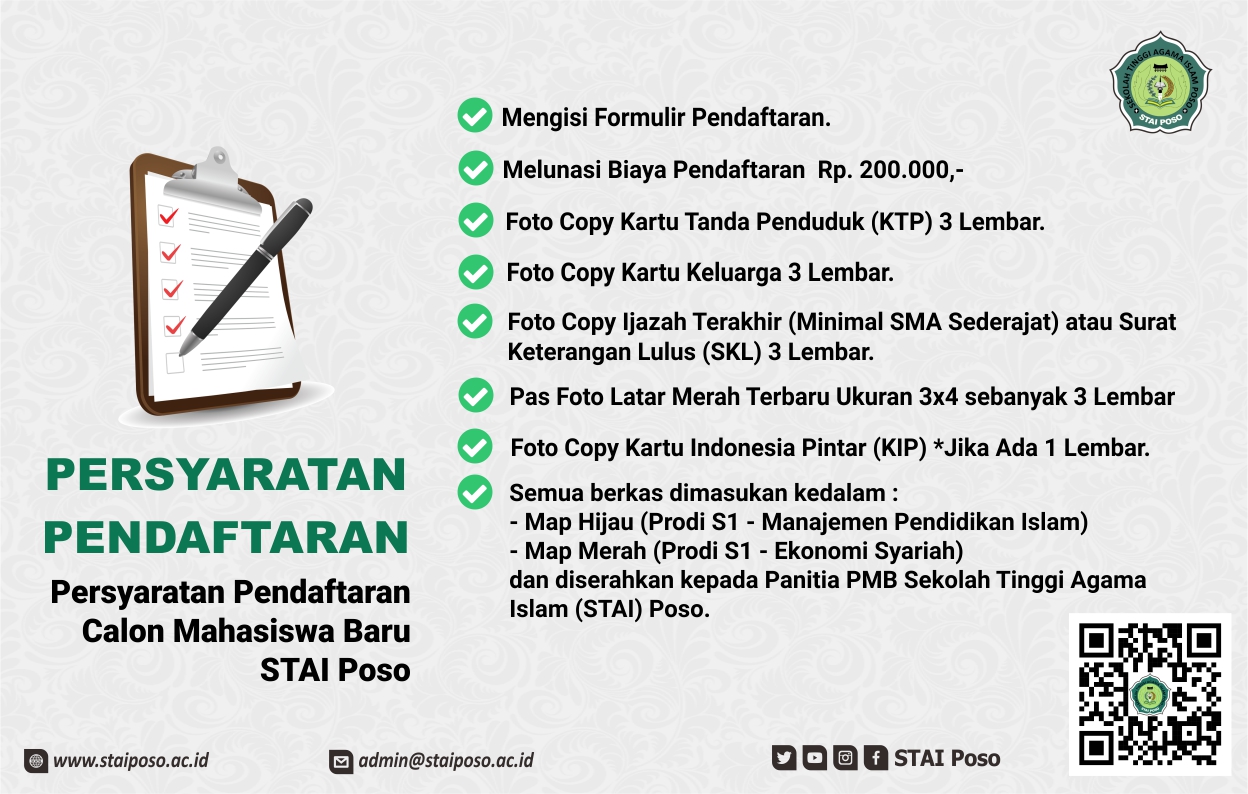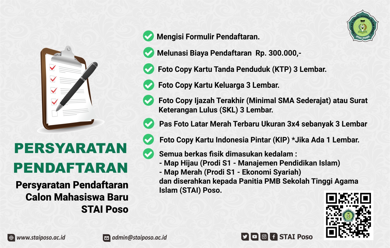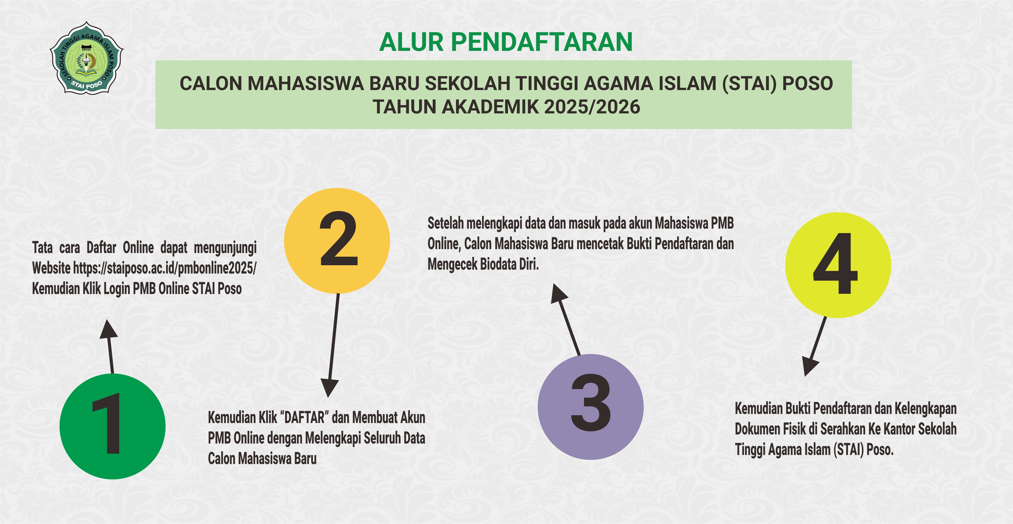 Sekolah Tinggi Agama Islam (STAI) Poso menyediakan sebuah Sistem Aplikasi PMB secara online diharapkan proses PMB dapat berjalan cepat dan bisa dilakukan dimanapun dan kapanpun selama sistem PMB dibuka. Proses pendaftaran calon mahasiswa baru di era teknologi informasi ini bisa mengakses dimanapun selama memiliki jaringan internet, dengan bisa mengakses website sistem PMB STAI Poso Sekolah Tinggi Agama Islam (STAI) Poso.